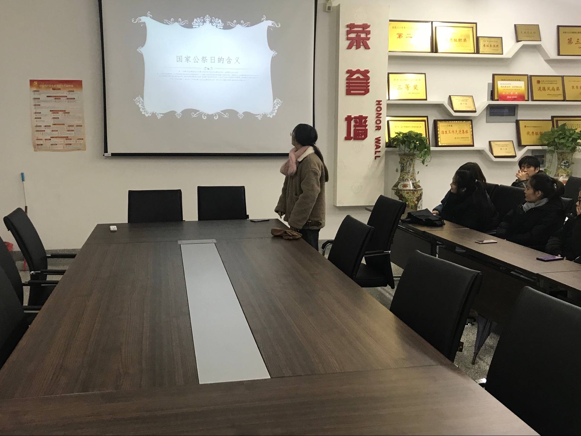 12月10日,应化1631班全班同学在药学院会议室开展了“ 国家公祭日”主题班会,会议由孔星星同学主持。