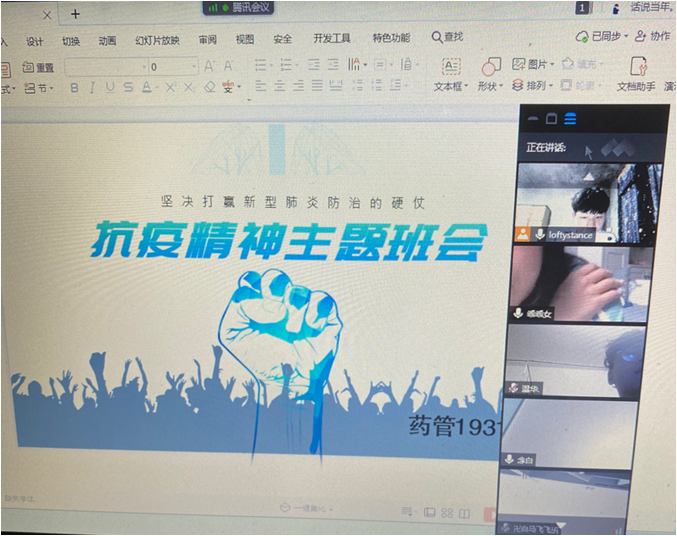 6月5日晚,药管1931班召开了抗疫精神线上主题班会。利用腾讯会议网络直播,学生积极参与,各抒己见,在沟通与交流中感悟抗疫精神。