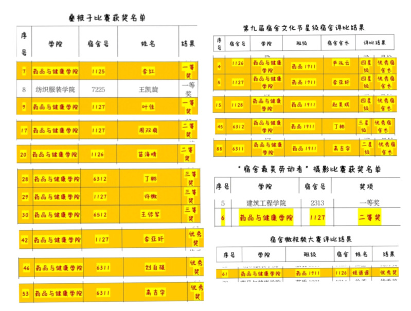 我班1127宿舍获得最美劳动者摄影比赛二等奖。1126、1127、1128宿舍被评为四星宿舍,6311、6312宿舍分别被评为二星和三星宿舍,劳苦功高的宿舍长们也成为优秀宿舍长。李红、叶佳获得叠被子比赛一等奖,周双爽、苗海晴获得二等奖,丁彬、许微、王传军获得三等奖,李亚纤,刘自强,高吉宇获得优秀奖;1126宿舍程逍遥也在宿舍微视频大赛中荣获优秀奖。