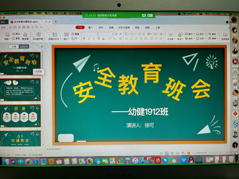 为增强学生的安全防范意识和避险能力,3月7日幼健1911、1912班全体同学在线上开展了“安全教育”主题班会。班会内容主要包含在校安全、疫情防控、网络诈骗及宿舍防盗。