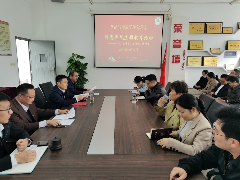 10月27日下午,药品与健康学院党总支在学院305会议室开展师德师风主题教育活动,全体教职工参加活动,活动由党总支副书记杨勇主持。