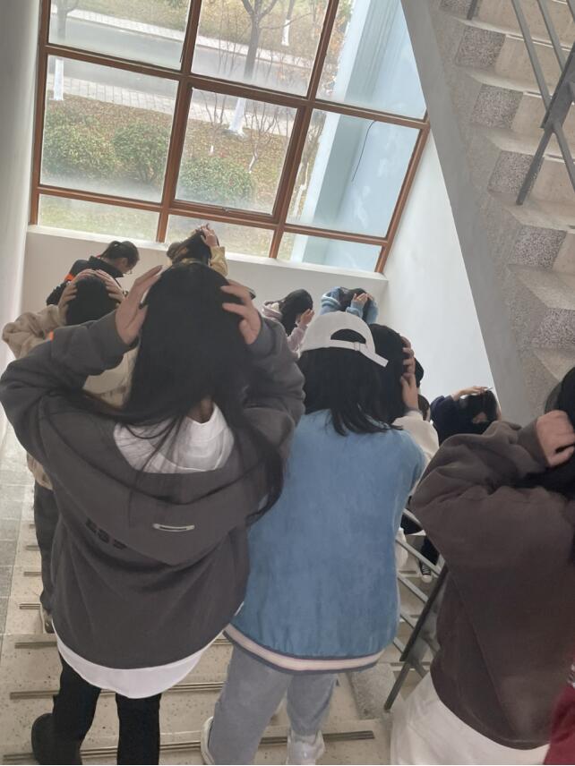 首先,高菲凡带大家学习了地震中的标准求生姿势,如身体尽量蜷曲缩小,卧倒或蹲下;自我保护姿势:头尽量向胸靠拢,闭口,双手交叉放在脖后,保护头部和颈部。以及地震来了怎么办:蹲下,掩护,抓牢等等。其次,安排好逃生路线,本班同学所在的院部201教室到靠楼梯下楼逃生,班级同学根据口令,双手抱头,有秩序的撤离,不到一分钟的时间全部撤离完毕。