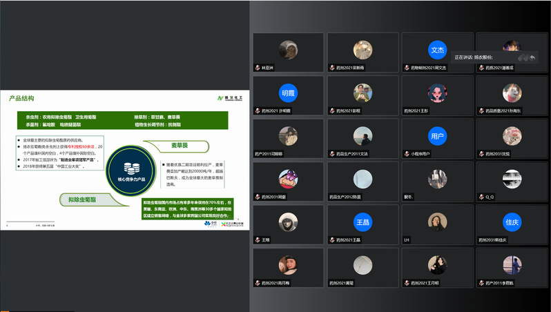 扬农化工股份有限公司成立于1999年,是中国中化控股有限责任公司旗下成员企业,目前已有员工3000多人。本次招聘会通过线上直播的方式,向同学了介绍了公司的发展历程、招聘岗位、薪资待遇以及晋升体系,并且解答了同学们的提出的各种问题。