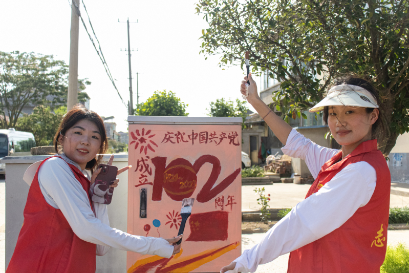 (图为小分队成员为乡村画红色彩绘)