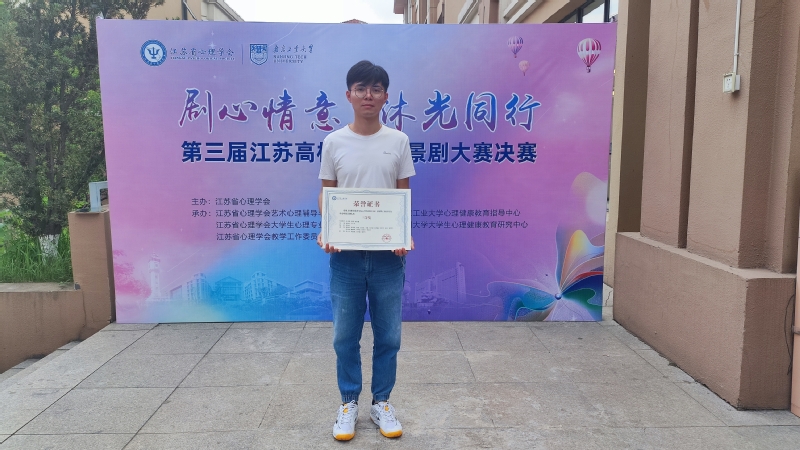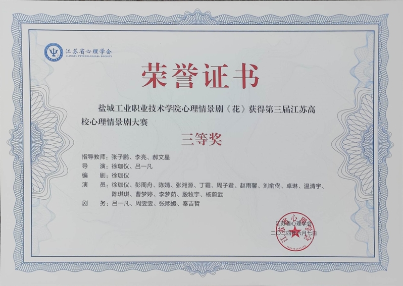 6月7日,由江苏省心理学会主办的第三届江苏高校大学生心理情景剧大赛决赛在南京工业大学举办。经过激烈角逐,我院报送的作品《花》荣获三等奖,张子鹏、李亮、郝文星被评为“优秀指导教师”。