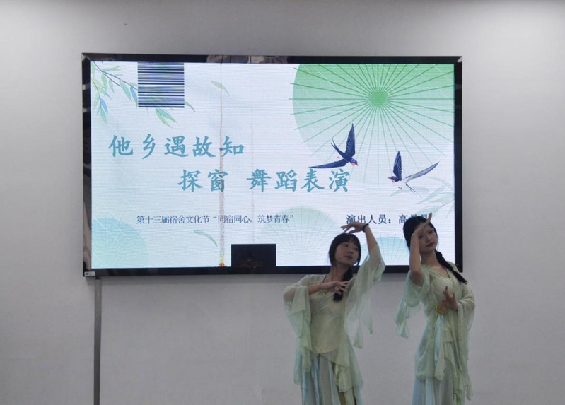 高晶晶、陈艳表演《他乡遇故知—探窗》舞蹈,表演者轻盈优美,舞姿曼妙,演绎着离家游子偶遇知己时,内心的归属感和亲切感,散发着青春的风采。